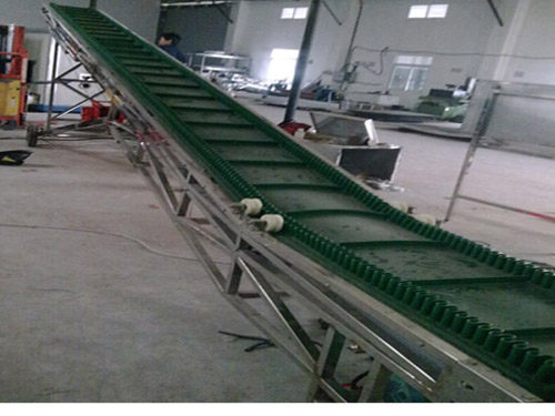 擋邊帶由基帶、擋邊和隔板組成,基帶外觀同曾通輸送帶,但橫向剛度更大:擋邊為波浪狀:陋板按其不 的斷面可分為T型、C型和TC型。T型適用于傾角β≤40°場(chǎng)合,C型適用于傾角β>40°且物料流動(dòng)性較好的場(chǎng)合,TC型適用于傾角β>40°,物料粘性較大,粘度較大的場(chǎng)合。